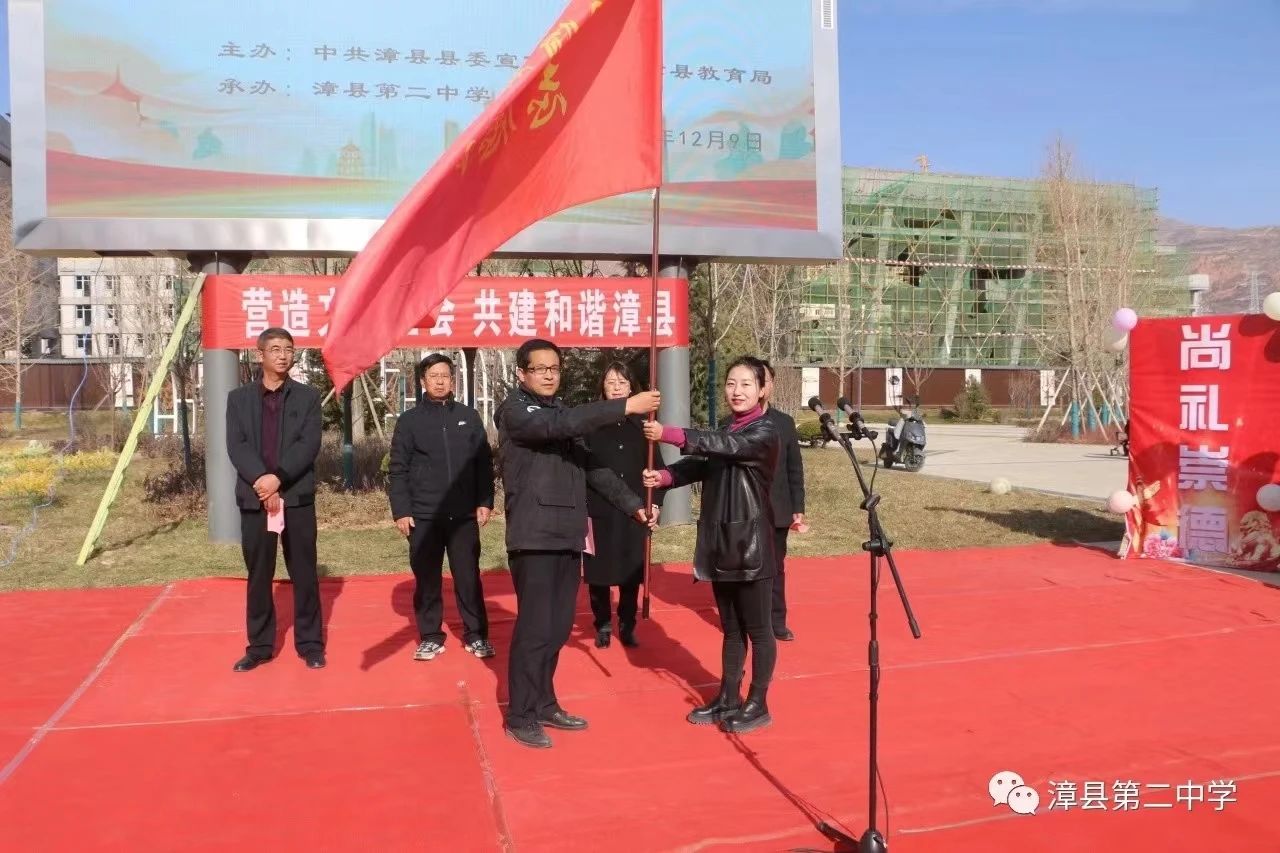 漳县盐川小学德育副主任贾凯丽给漳县武阳中学政教主任包建伟传“文明习惯养成志愿队”队旗。