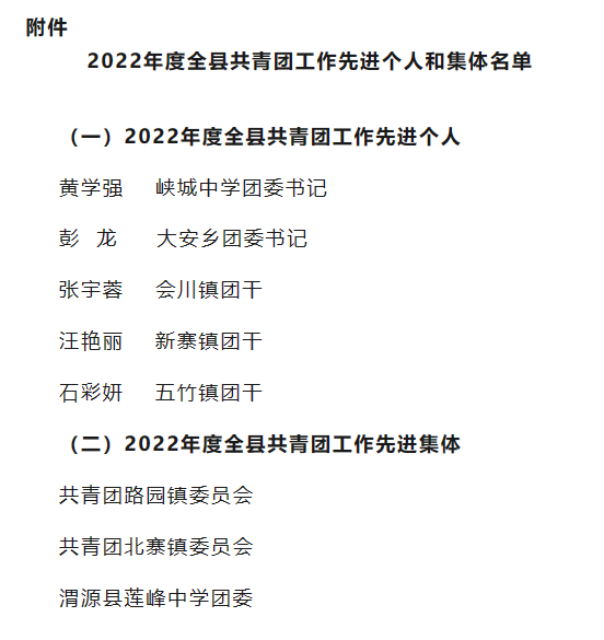 为激励全县广大青少年在实现第二个百年奋斗目标中奋勇争先,在建设人民满意的“五新”渭源中贡献青春智慧和力量,经研究决定,授予黄学强等5名同志“2022年度全县共青团工作先进个人”荣誉称号,各颁发荣誉证书一本;授予共青团路园镇委员会等3个集体“2022年度全县共青团工作先进集体”荣誉称号,各颁发奖牌一面。
