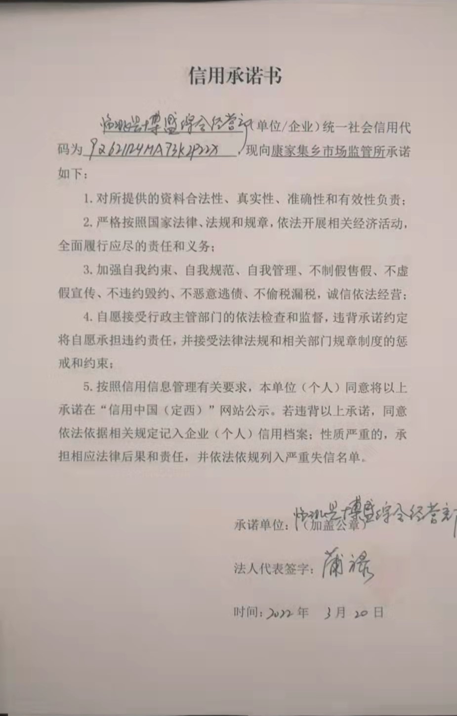 通渭县兴鑫装卸搬运有限公司信用承诺书
